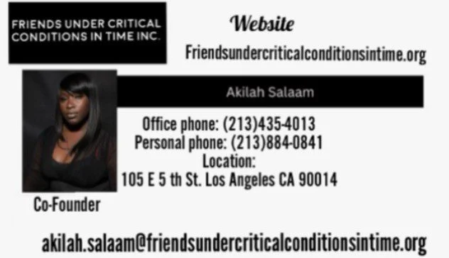 Co-Founder of Friends Under Critical Conditions In Time Inc., Akilah Salaam supports program development, community engagement, and peer-led initiatives that empower individuals through connection, advocacy, and voluntary support services.